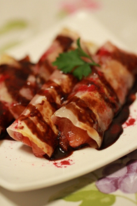 - Bにこんがり焦げ目が付いたらチョコソースをかけて完成。